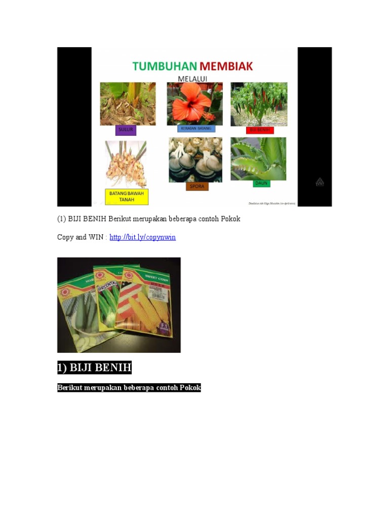 Contoh tumbuhan yang membiak melalui biji benih ialah. Jenis tumbuhan membiak melalui anak pokok. Pokok pisang dan pokok keladi.